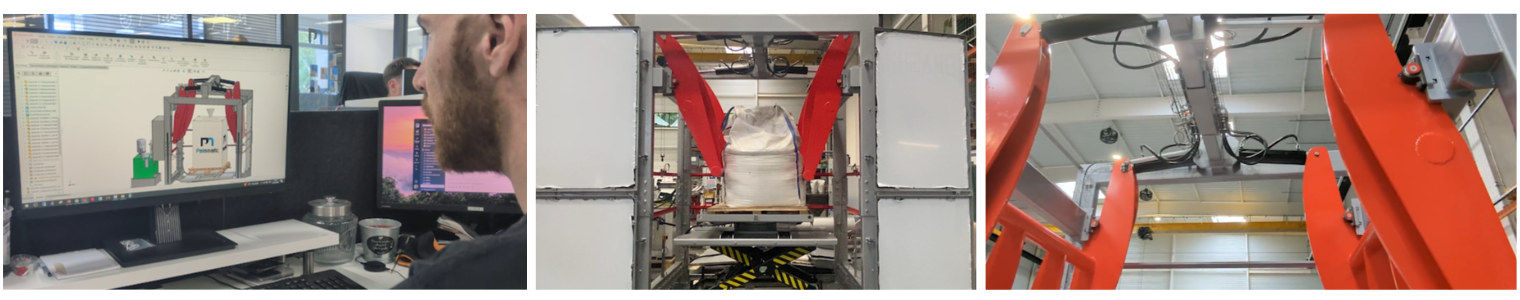 Het station maakt gebruik van vier zijdelingse hydraulische cilinders en een bovenste arm om gecontroleerde druk uit te oefenen op de wanden van de big bag.
